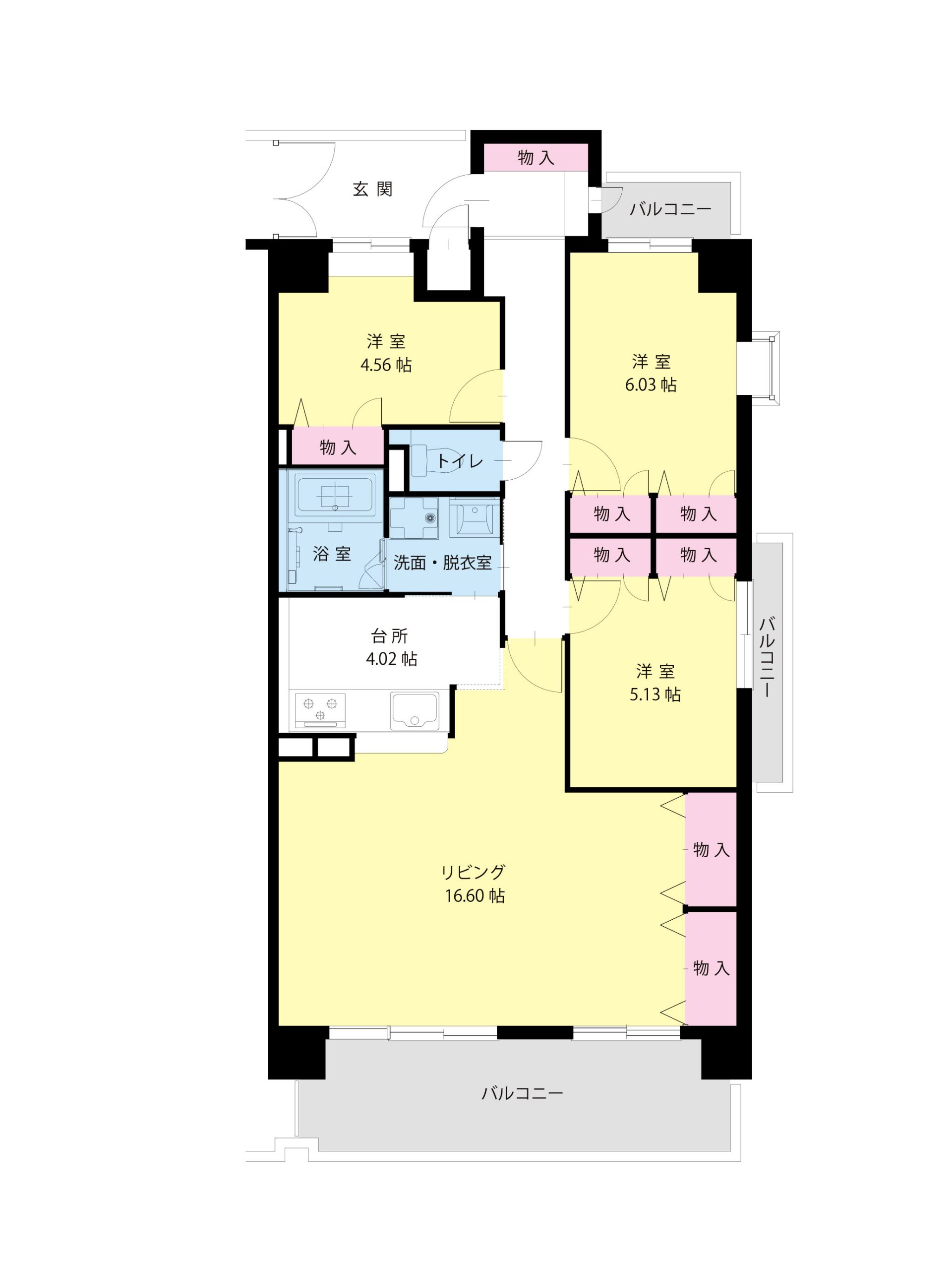 3LDK 洋室4.5帖・6.0帖・5.1帖/LDK16.6帖